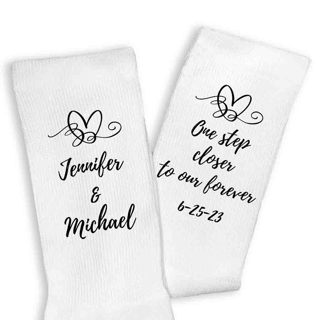 The perfect socks for the groom to wear on his wedding day! Personalized with a different design on each sock, we include the wedding date as well as the bride and groom’s first names. The groom will love wearing these special socks with wedding sentiments that will create happy memories