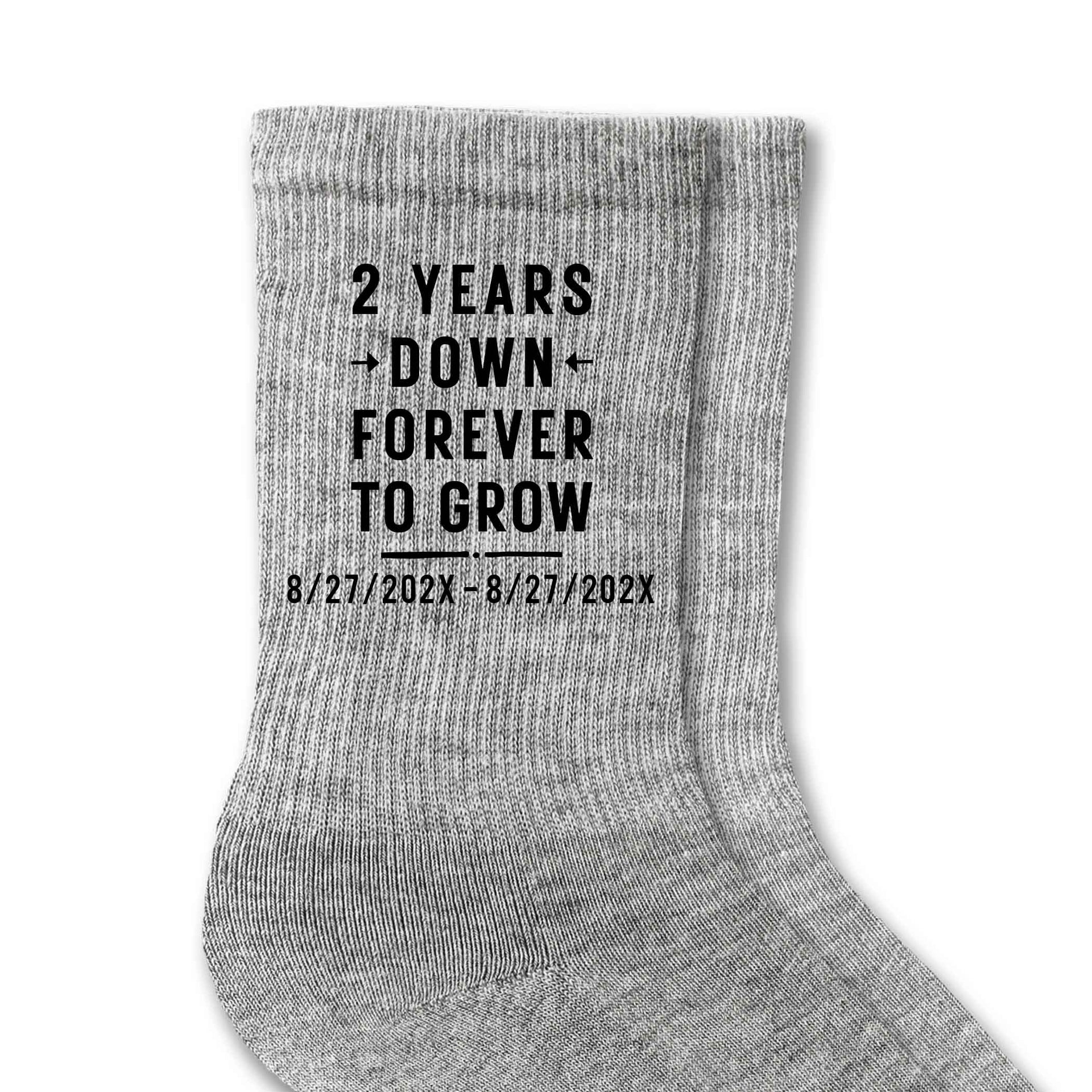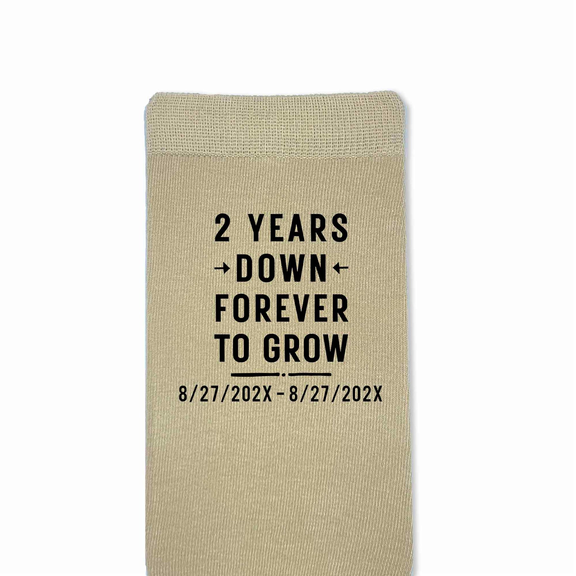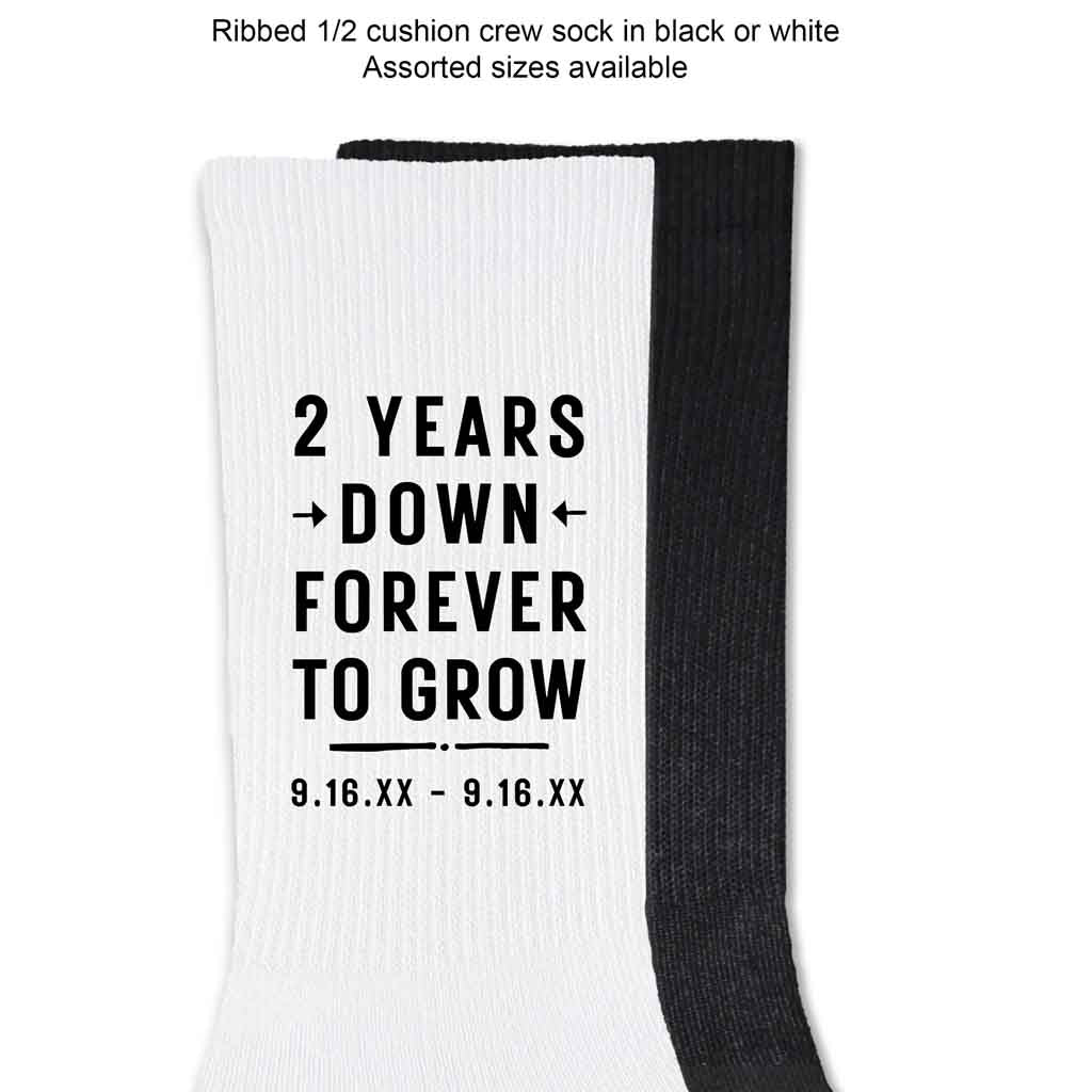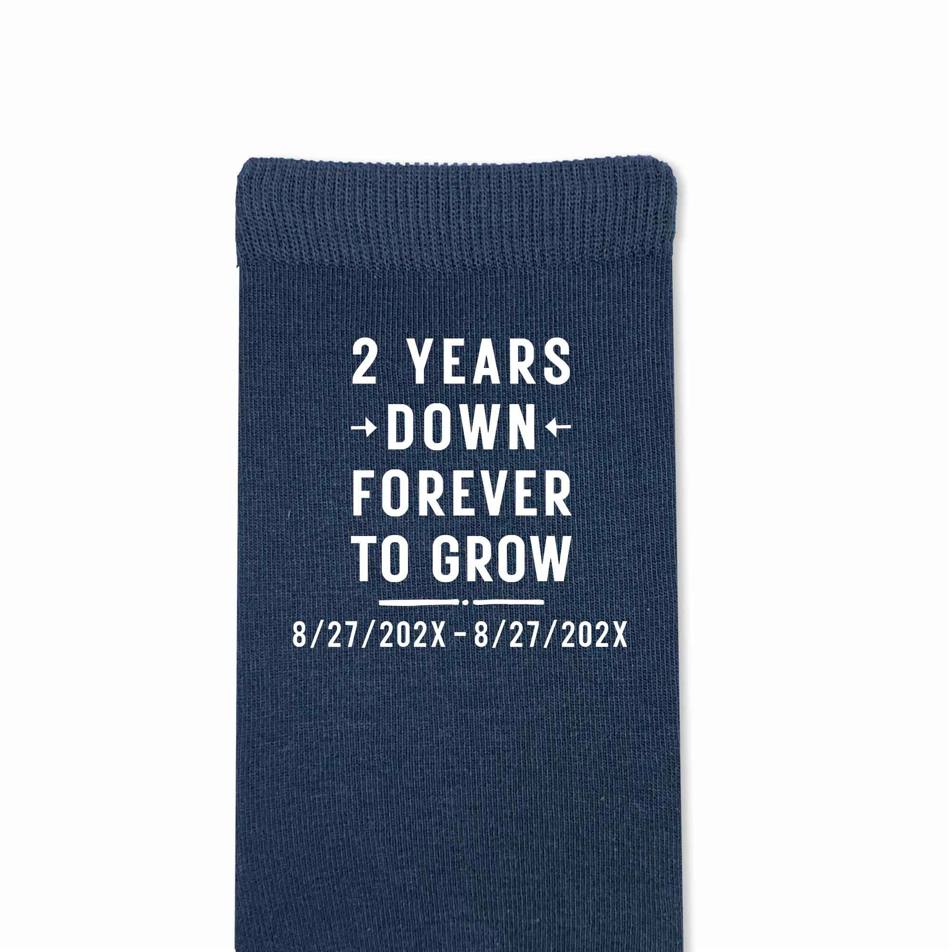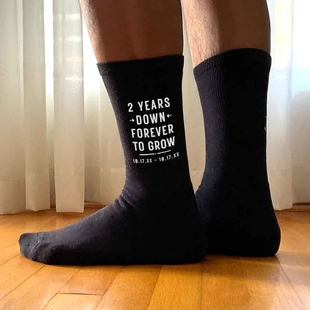 Celebrate two years of love, laughter, and growth with a modern update to one of our best-selling designs. These personalized cotton-blend anniversary socks feature the phrase “2 years down, forever to grow” along with your wedding date, printed boldly on the outside of both socks. A sentimental keepsake that’s wearable, comfortable, and designed to last.