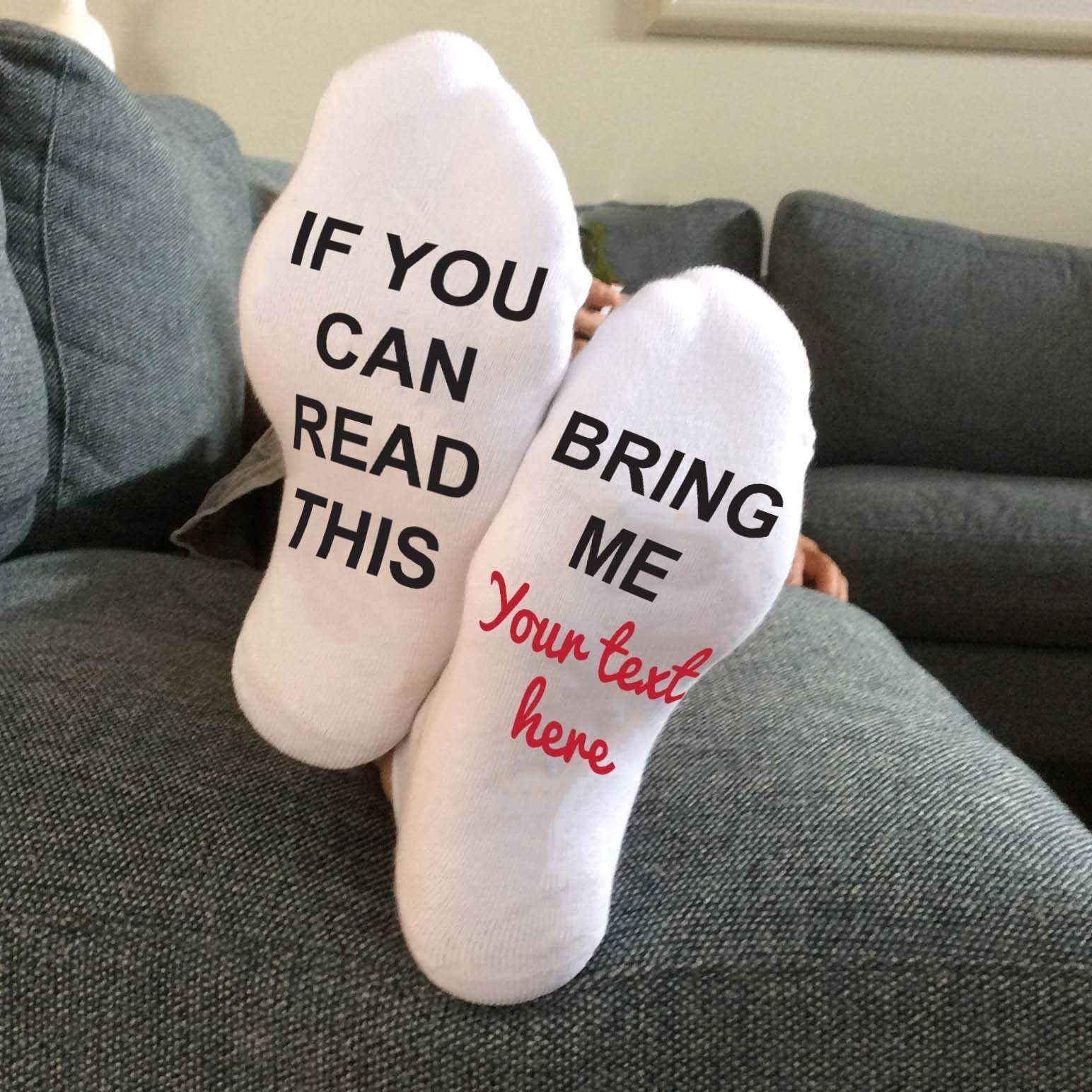 A fun and humorous pair of socks printed with text on the bottom of the socks - the perfect way to get what you want without saying a word. When worn, the socks have an "If you can read this" saying on the soles and the message can be read by anyone who is a few feet away. Wiggle your toes a few times to get some attention and see what happens! Select from our pre-designed messages or create your own by typing in your custom text.