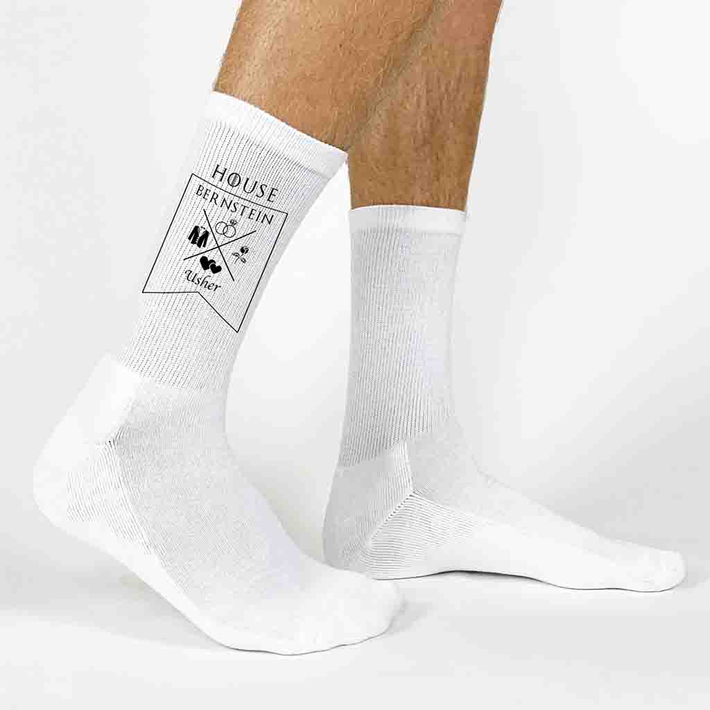 If you’re looking for a “Family House” wedding theme, these personalized socks are the perfect fit for the wedding party. The design includes the groom’s last name and each pair can be personalized with the wedding role for each person. A practical and memorable gift for the wedding day. A great idea to include family members too. Grandfather of the Bride or Groom, Uncles, Step Fathers, or any other family member can have a pair of personalized socks too!