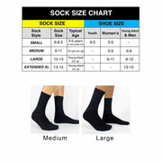 These socks are made from a 1/2 cushion cotton blend, offering comfort and durability. Available in a black crew sock style, they're machine washable and easy to care for—just wash warm, use non-chlorine bleach, and tumble dry. Check out our size chart in the product images to find your perfect fit.