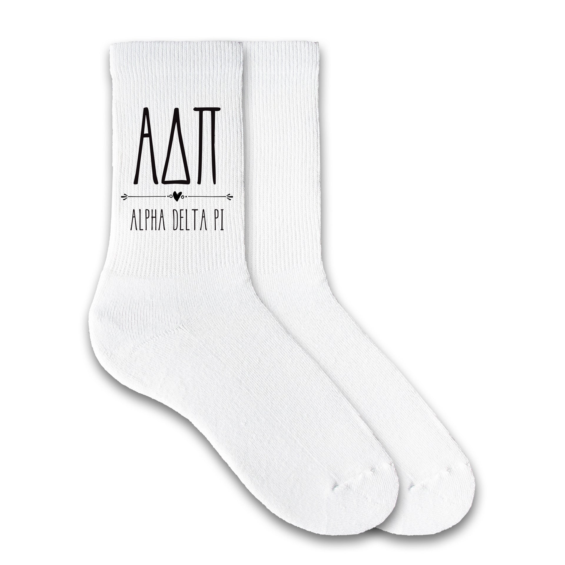 Show off your sorority pride with a pair of these cute sorority crew socks. One of our best-selling stylized designs printed on cotton crew socks. Perfect for everyday wear. Makes a great gift idea for a little, big, and gbig on any occasion and the perfect roomy size for everyday use. Perfect for chapter orders and bid day.