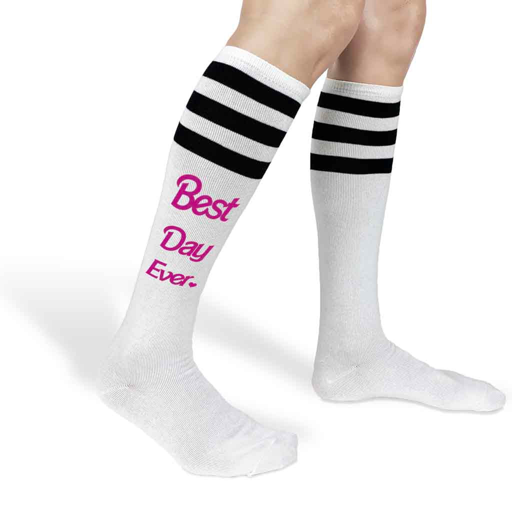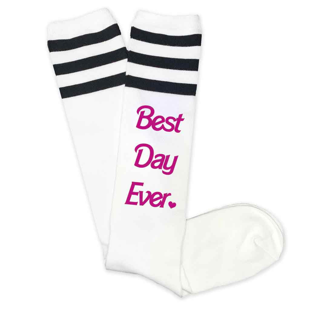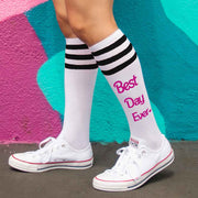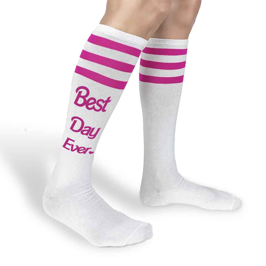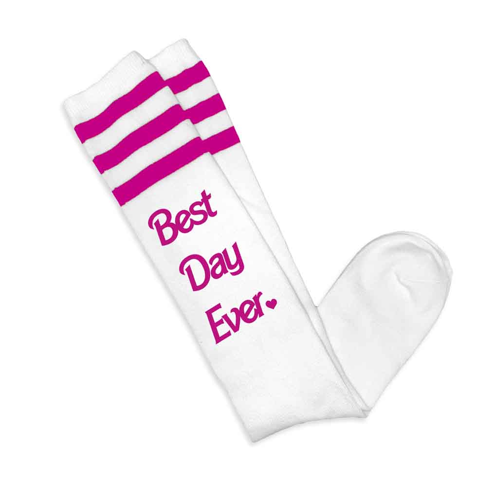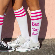 Best Day Ever Knee High Socks with Barbie Pink Stripes