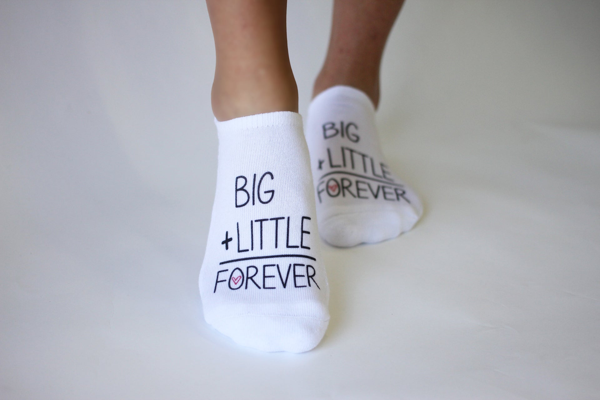 A great gift for your Big or Little! Sold by the pair, our 1/2 cushion no-show socks are both comfy and adorable! Printed is a cute Big + Little = Forever Math Equation design.