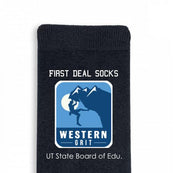 Cotton/poly blend flat knit crew socks - machine wash warm, do not use products containing bleach (may fade the ink), and tumble dry. Also available in navy.
