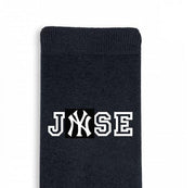 About black and navy socks: The printing process requires a base layer of white ink to be applied for the colored inks to visible. You may notice ink cracking when stretching the socks which is normal.
