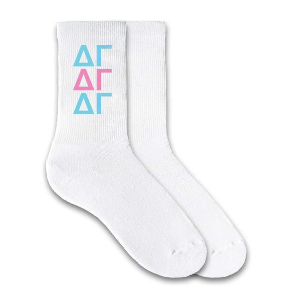 Our super cute sorority socks with Delta Gamma letters shown 3 times are sold by the pair, and our 1/2 cushion crew socks are comfy too. Sockprints is a licensed vendor for all 26 NPC sororities.